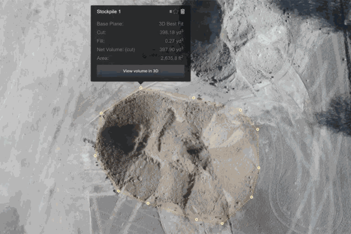 With 3D mapping software, it is also possible to obtain volumetric measurements from the very same images. This fast and inexpensive method of volume measurement is particularly useful to calculate stocks in mines and quarries for inventory or monitoring purposes.